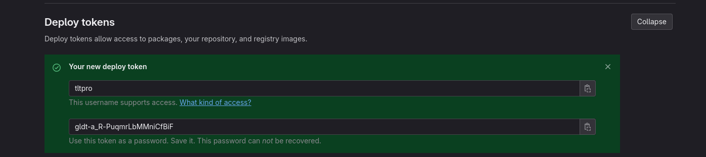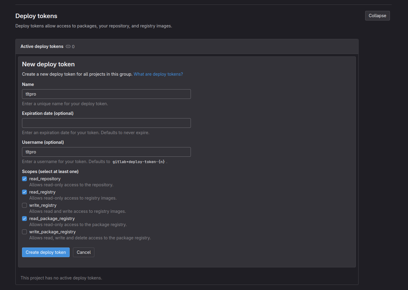 Необходимо заполнить Name, Username, read_repository, read_registry, read_package_registry